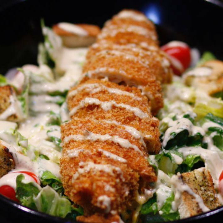 کاهو - رول مرغ سوخاری شده با پنیر - گوجه گیلاسی - نان تست سیردار - پنیر پارمسان - سس سزار
